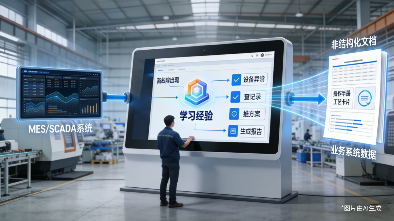 在工业现场,知识、数据与响应像三条被撕裂的传送带:操作手册、工艺卡片、异常处理经验散落于档案柜、硬盘和师傅的脑海,人员一流动,经验便随人归零;OT 的电流、温度、振动与 ERP、MES 的订单、物料、质检各说各话,TB 级数据堆成沉默的矿渣,让品质波动、设备停机、交付延期成为周期性“魔咒”;异常灯亮起,仍靠两条腿巡检、一张表复盘,从报警到根因动辄数小时,报废与客户投诉已排好队。